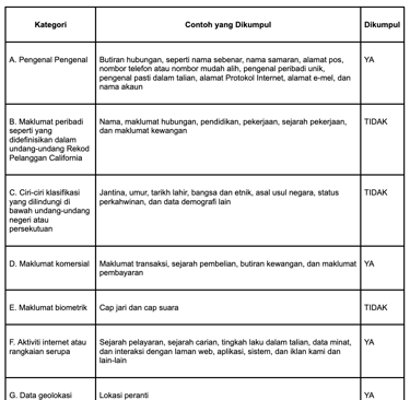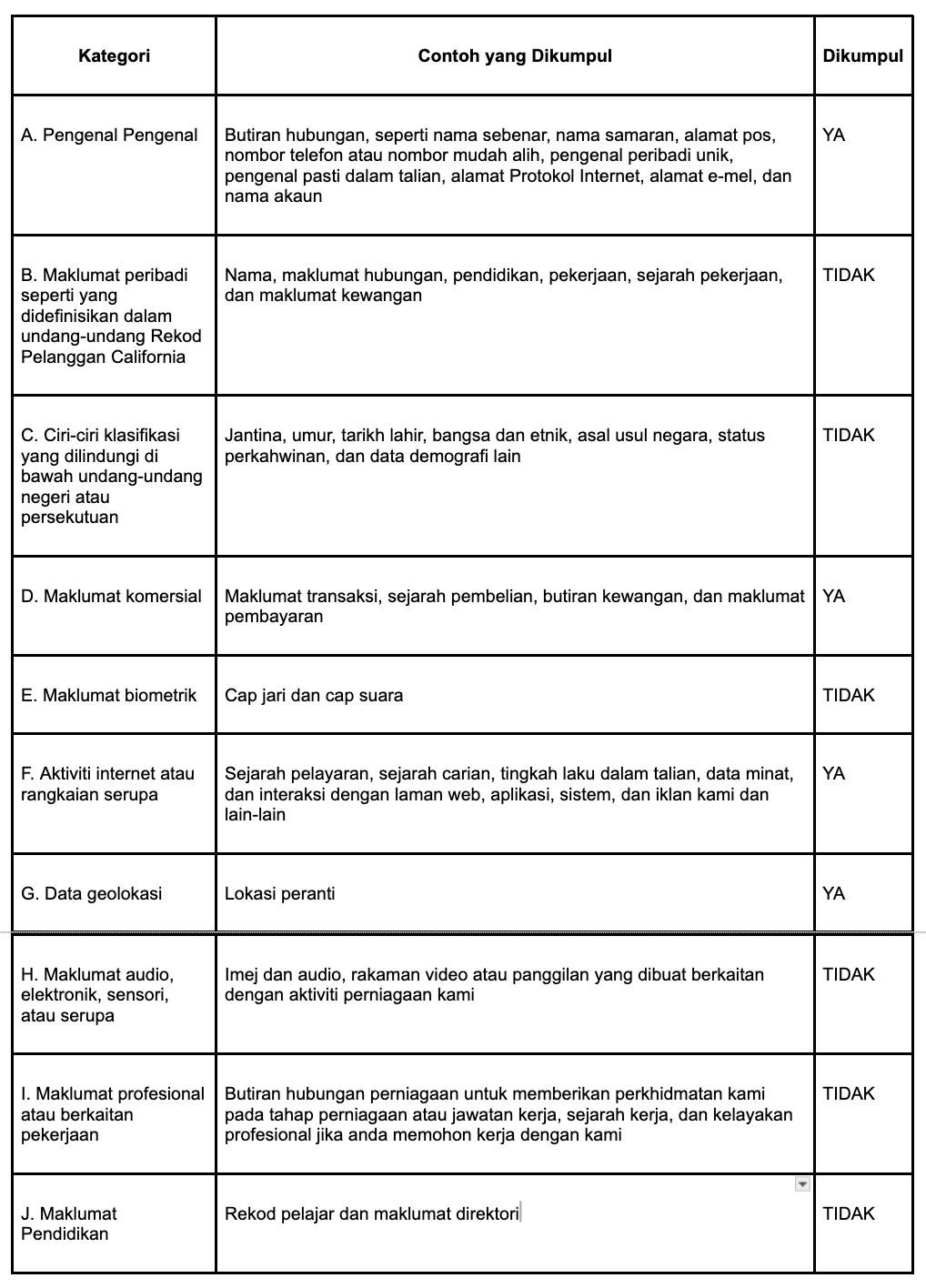Kami telah mengumpul kategori maklumat peribadi berikut dalam tempoh dua belas (12) bulan yang lepas: