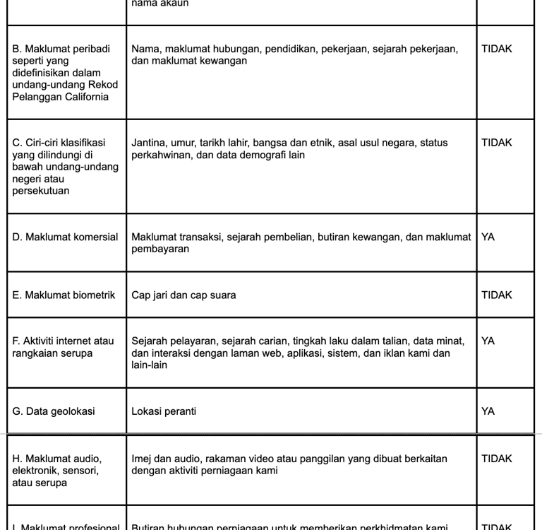 Kami tidak mendedahkan, menjual atau berkongsi sebarang maklumat peribadi kepada pihak ketiga untuk tujuan perniagaan atau komersial dalam tempoh dua belas (12) bulan yang lalu. Kami juga tidak akan menjual atau berkongsi maklumat peribadi pelawat laman web, pengguna, dan pengguna lain pada masa hadapan.